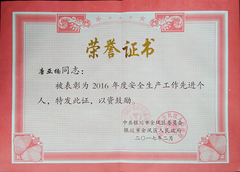 唐亞楠總經(jīng)理榮獲“2016年度安全生產(chǎn)工作先進(jìn)個(gè)人”榮譽(yù)稱號(hào)