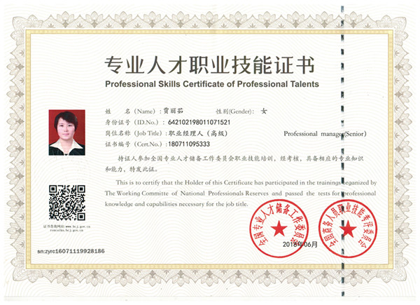 銀川伊百盛生物工程有限公司行政部經(jīng)理賈麗茹榮獲“專(zhuān)業(yè)人才職業(yè)技能證書(shū)”